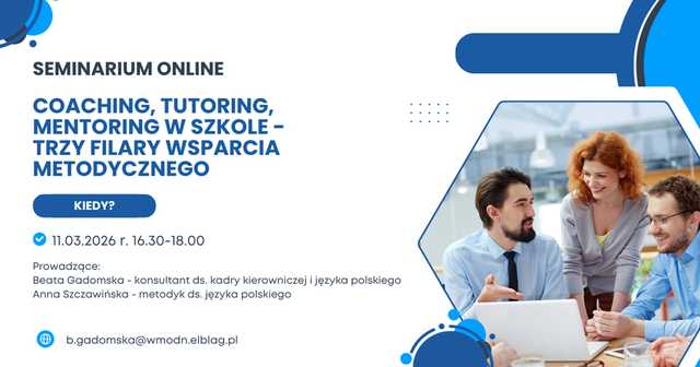 Warmińsko-Mazurski Ośrodek Doskonalenia Nauczycieli w Elblągu uprzejmie zaprasza na bezpłatne seminarium dla dyrektorów, nauczycieli języka polskiego i języka angielskiego pt. „Coaching, tutoring i mentoring w szkole – trzy filary wsparcia metodycznego”, które odbędzie się 11.03.2026 r. w godzinach od 16.30 do 18.00 (online).